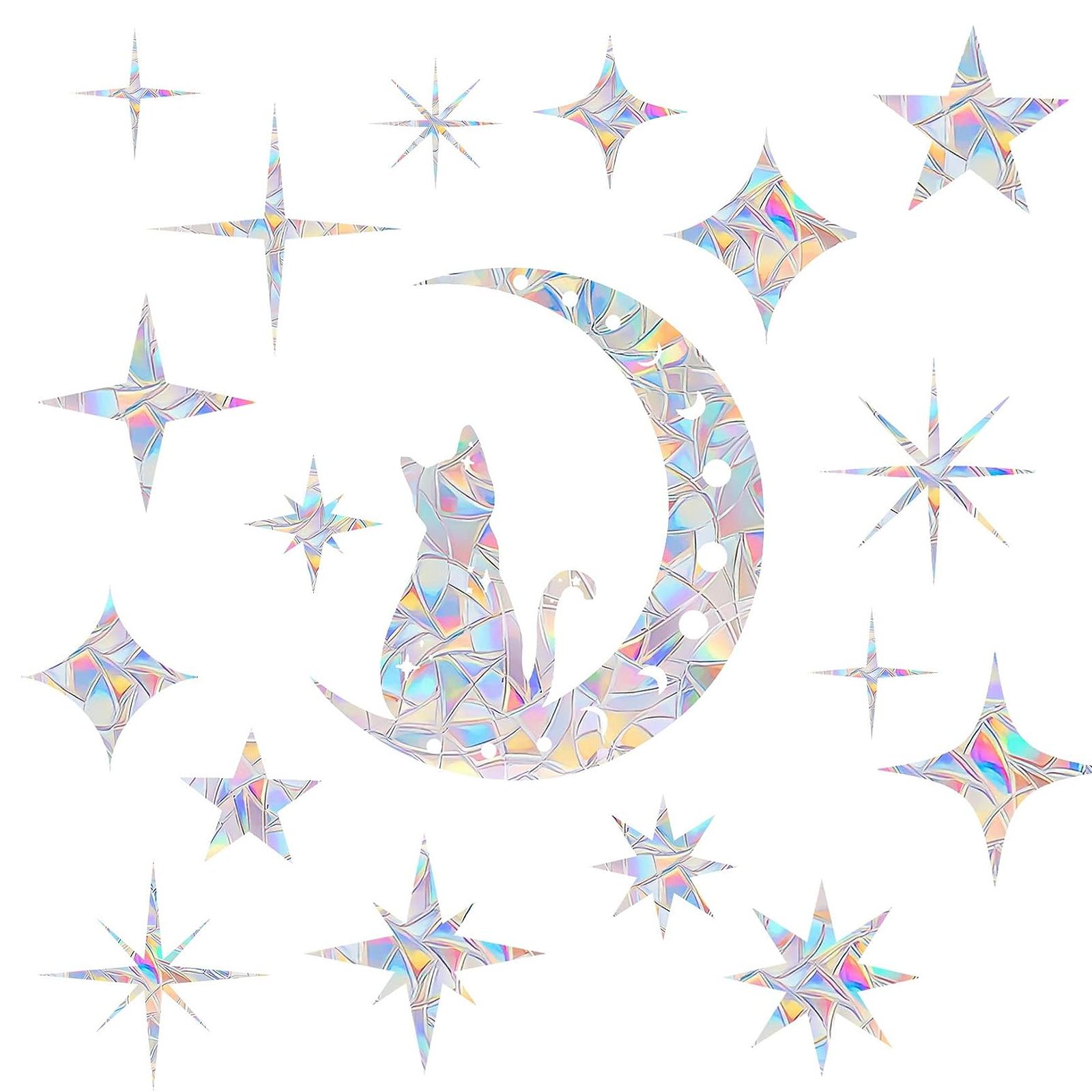 Cat Moon and 54PCS Star Window Clings - Anti-Collision Decals to Save Birds, Non-Adhesive Prismatic Vinyl Clings (Rainbow Stickers)