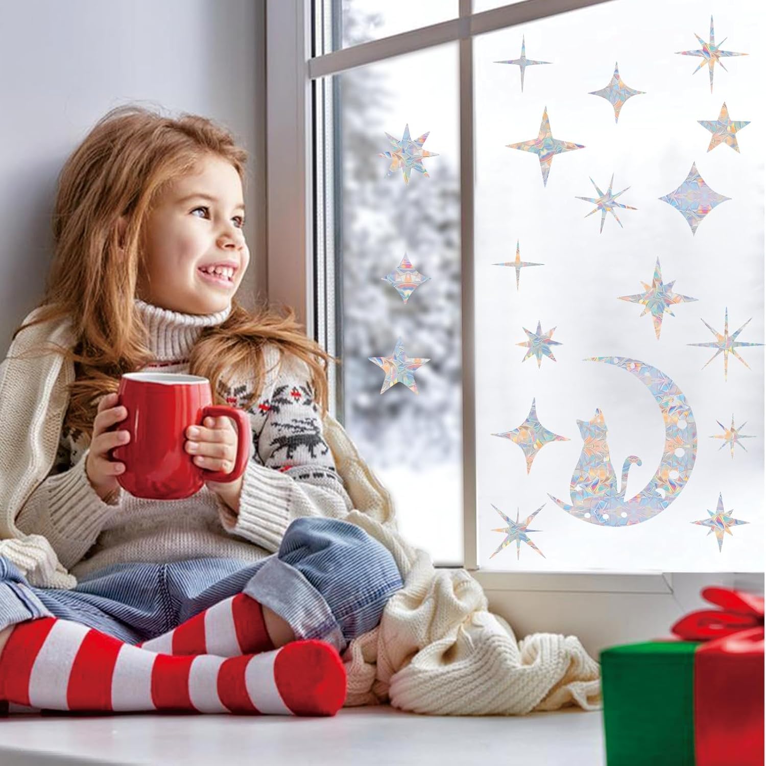 - window decals to prevent bird strikes The package contains 54PCS Cat Moon and Star Window Stickers Decal.These window decals can be used as a bird deterrent and beautiful home décor.
